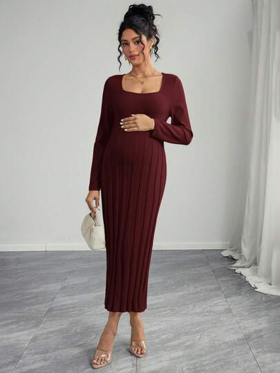 Momance Vestido de punto de manga larga con cuello cuadrado, ajuste holgado y bajo acampanado para mujeres embarazadas, cómodo y elegante - Burdeos - Añade 1