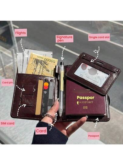 Portapassaporte y estuche para tarjetas multifuncional, funda de pasaporte de piel sintética para viajes, escuela, vacaciones, viajes de negocios, adecuado para hombres y mujeres - Burdeos - Añade 1
