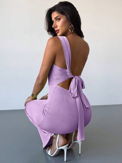 Firerie Vestido largo verde con escote en la espalda y volantes, vestido elegante para vacaciones, Día de San Valentín, temporada de bodas, Día de San Patricio, primavera/verano - Morado Violeta - Añade 1