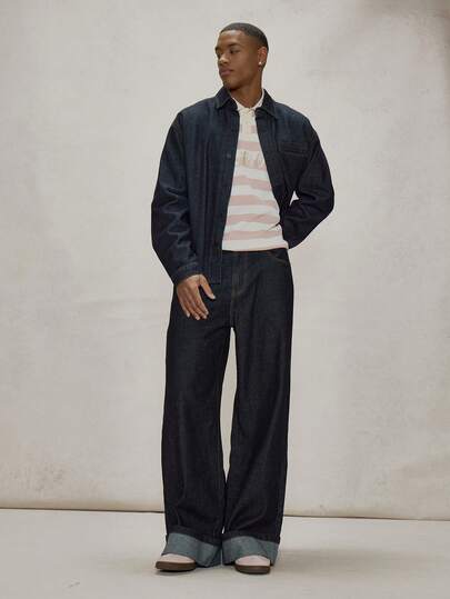 Musero Pantalones vaqueros esenciales de primavera y verano con piernas anchas y holgadas, puños vueltos, costuras de contraste, detalles de presilla y cinturón - Azul lavado oscuro - Añade 1