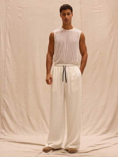 Musero Pantalones rectos de pierna recta con cintura con cordón de contraste de satén, para primavera, verano, estilo callejero, vacaciones, playa - Blanco - Añade 4