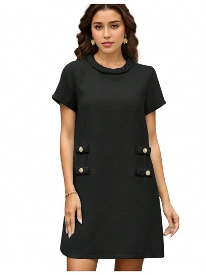hoteel Vestido recto elegante estilo Old Money, vestido corto de manga corta con cuello redondo, ropa de mujer - Negro - Añade 5