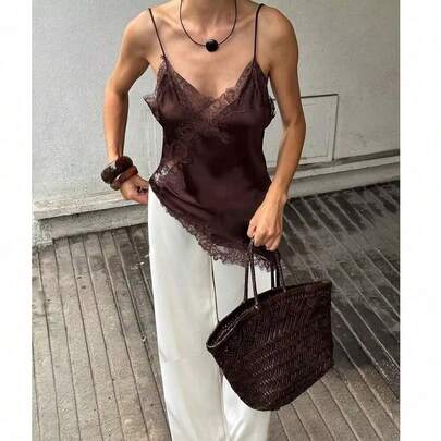 Nueva llegada Camiseta de mujer con decoración de encaje sexy - Marrón - Añade 7