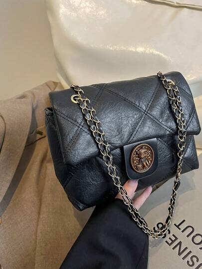 Nueva bolsa cuadrada de moda versátil con cadena, de estilo minimalista, con bordado y rayas, chic y linda con diseño de oso cruzada diagonal de hombro - Negro - Añade 1