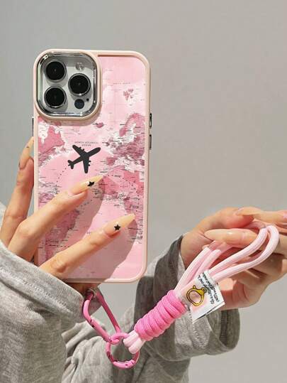 Funda de teléfono de viaje 1 pieza Patrón clásico de rayas verticales con diseño de ruta de vuelo de avión y mapa de color rosa pálido, a prueba de caídas, compatible con Apple y resistente al agua, a los golpes y a los arañazos - Multicolor - Añade 1