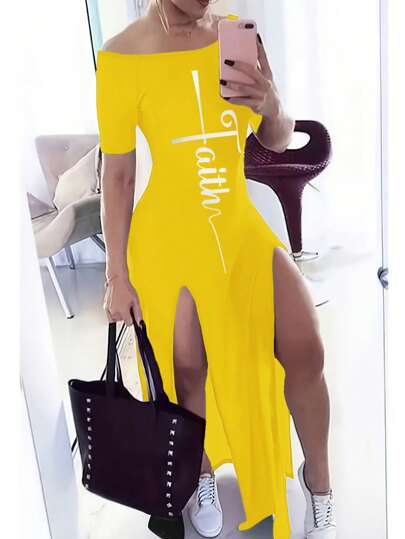 Chiquease Vestido ajustado con hombros descubiertos, estampado de letras y abertura lateral maxi para mujer - Amarillo - Añade 1