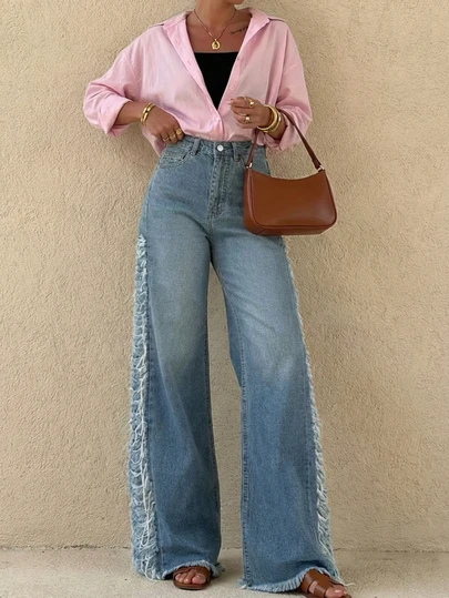 Chaqueta de mezclilla casual con bolsillos con cremallera y bordes deshilachados en degradado, para uso diario - Azul - Añade 4