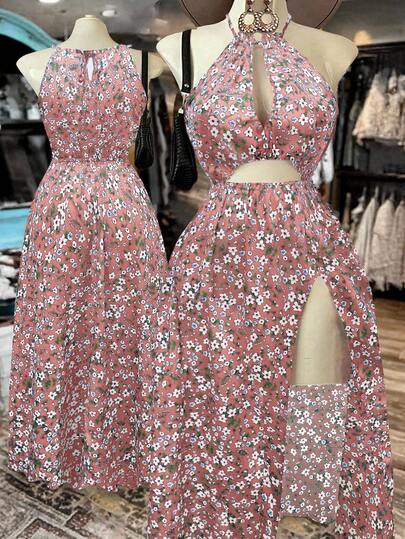 Sweetra Vestido con cuello hueco y abertura para mujer talla grande, elegante estampado floral vintage, adecuado para vacaciones de primavera/verano y playa - Rosa - Añade 5