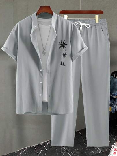 Conjunto de camisa de manga corta de un solo pecho con estampado de árboles de coco y pantalones largos con cordón, ropa cómoda para hombres - Gris - Añade 5