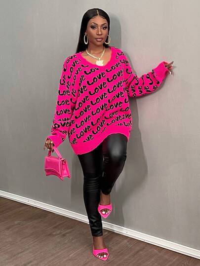 Slaydiva Jersey con gráfico de amor de contraste de color de manga larga y cuello en V básico, talla grande, otoño/invierno - Rosa Fucsia - Añade 3