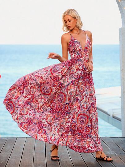 Vivid Eden Vestido de tirantes con estampado de paisley con tira cruzada de espalda abierta - Rojo - Añade 1