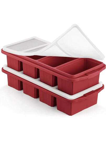 Bandeja de congelador de silicona con tapa - Moldes de alimentos congelados de silicona - Bandeja de cubitos de hielo grandes, Recipiente de congelador de silicona, Congela y almacena sopa, salsa, caldo, sobras - Hace 4 porciones perfectas de 1 taza - Paquete de 2 - Rojo - Añade 2
