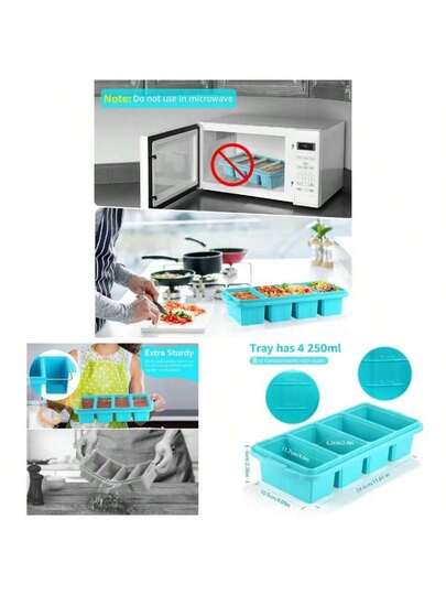 Bandeja de congelador de silicona con tapa - Moldes de alimentos congelados de silicona - Bandeja de cubos grandes, recipiente congelador de silicona, congela y almacena sopa, salsa, caldo, sobras - Hace 4 porciones de 1 taza - Paquete de 2 - Aguamarina - Añade 4