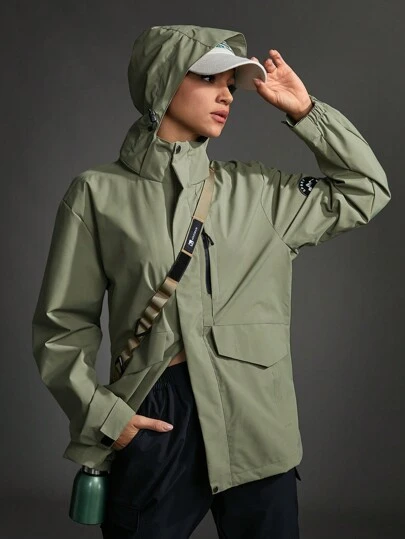 SHEIN Sports Chaqueta deportiva cortavientos con capucha y cierre de cremallera con detalles remendados - Verde militar - Añade 10