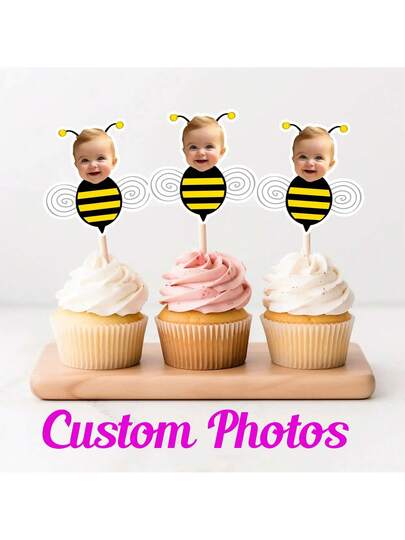 Decoraciones personalizadas para cupcakes - Foto personalizada de rostro - Decoraciones de fiesta personalizadas, imprimibles, decoraciones personalizadas, decoraciones de cupcakes con rostro personalizado, pegatinas de cumpleaños, dibujos animados personalizados, decoraciones de cumpleaños, 1er cumpleaños, tema de abeja para cumpleaños, 1er cumpleaños de abeja, decoraciones. - Adorno de pastel de abeja - Añade 1