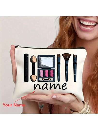 Neceser de maquillaje personalizado de poliéster de moda con patrones de herramientas de belleza y nombre personalizado - lavable a máquina, cierre con cremallera, ligero, resistente a la decoloración, bolso cosmético plegable para el Día de San Valentín, regalo para la mejor amiga - Multicolor - Añade 1