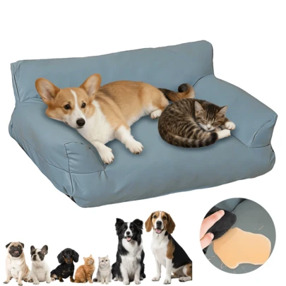 Sofá para Mascotas Vintage de Piel Sintética, Cama Elegante para Perros y Gatos, Base Antideslizante, Fácil de Limpiar, Grande (75x50x26cm), Naranja/Azul - Neblina azul - Añade 3