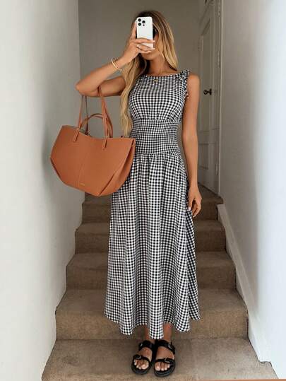 Easowa Vestido midi de línea A sin mangas para mujer con lazo en el hombro, cintura plisada, estampado a cuadros, casual, de vacaciones, elegante para uso al aire libre, primavera/verano, ropa bohemia estilo "Old Money" - Azul Marino - Añade 6