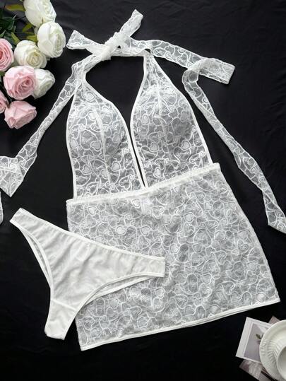 2 piezas Conjunto de lencería sexy de encaje talla grande - Blanco - Añade 3
