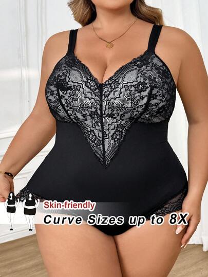 SHEIN CURVE+ Body casual de talla grande con parches de encaje y tirantes anchos - Negro - Añade 4