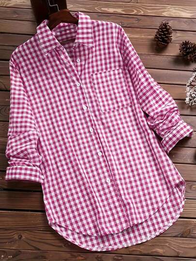 INAWLY Camisa A Cuadros Con Botones Y Bolsillos En El Pecho, Casual - Rosa Fucsia - Añade 1