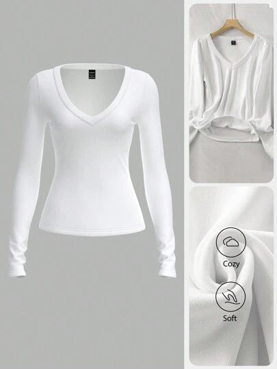 SHEIN BASICS Jersey liso con cuello en V de manga larga, ajustado y regular para mujer - Blanco - Añade 1