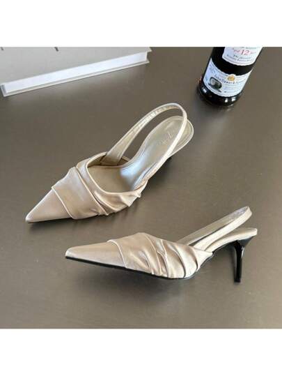 Tacones altos plisados con punta pequeña, correa de una sola línea, sandalias planas con punta, zapatos de vestir plateados para mujer. - Albaricoque - Añade 1