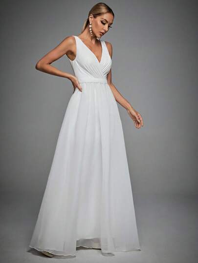 Vestido de novia de cuello profundo largo - Blanco - Añade 1