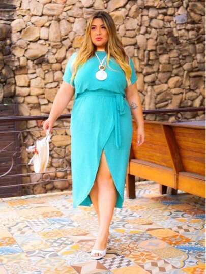 Plus Size Long Dress With Wrap Skirt And Belt