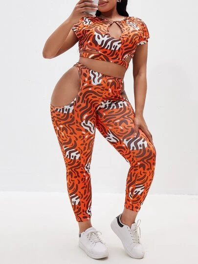 con estampado de cuello con abertura de ojo Camiseta corta & con abertura Leggings Conjunto deportivo - Multicolor - Añade 2