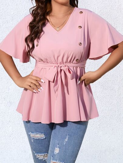 Celure Blusa peplum con diseño de botón de manga mariposa con cordón delantero - Rosa Pálido - Añade 1