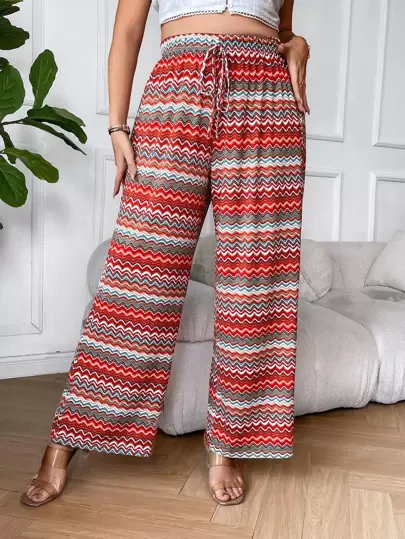 Pantalones de pierna ancha con estampado de cheurón de cintura con cordón - Multicolor - Añade 1
