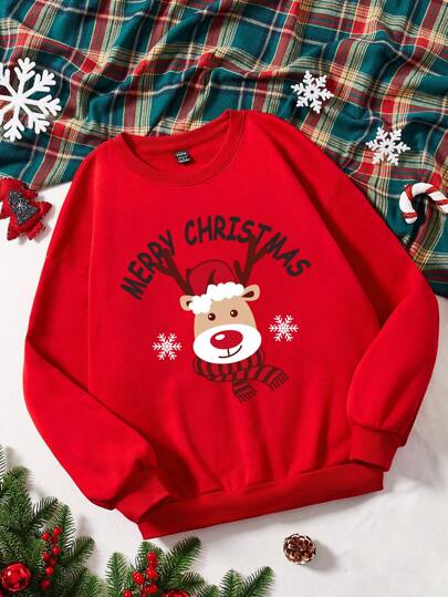 SHEIN Qutie Talla grande Sudadera con estampado de Navidad de hombros caídos - Rojo - Añade 6