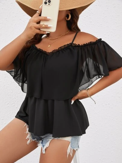 SHEIN Holidaya Blusa peplum de hombros descubiertos ribete fruncido - Negro - Añade 2
