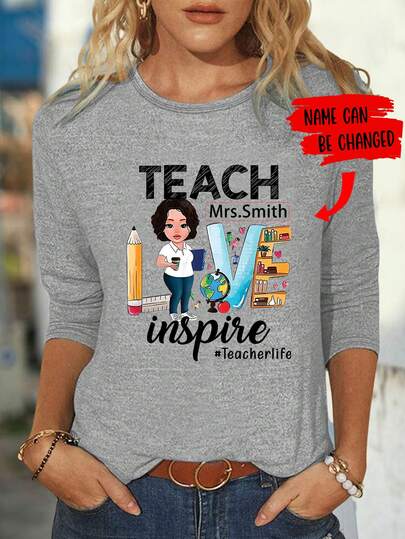 Pijama de manga larga con cuello redondo estampado personalizado, cómodo para otoño e invierno - Gris Claro - Añade 5