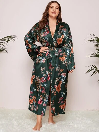Bata de dormir con estampado floral de hombros caídos con cinturón de satén sin lencería - Multicolor - Añade 1