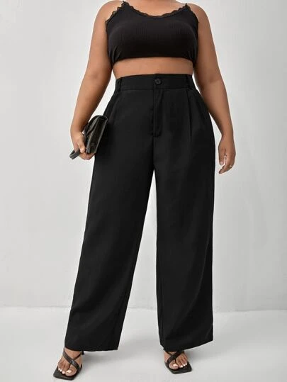 SHEIN Frenchy Pantalones de talle alto con pliegues y dobladillo para mujeres, ideales para graduaciones, regreso a clases y atuendos de maestras en otoño/invierno - Negro - Añade 1