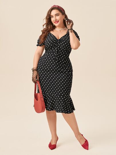 Vestidos Tallas Grandes Volante rígido Lunares Casual - Negro - Añade 4
