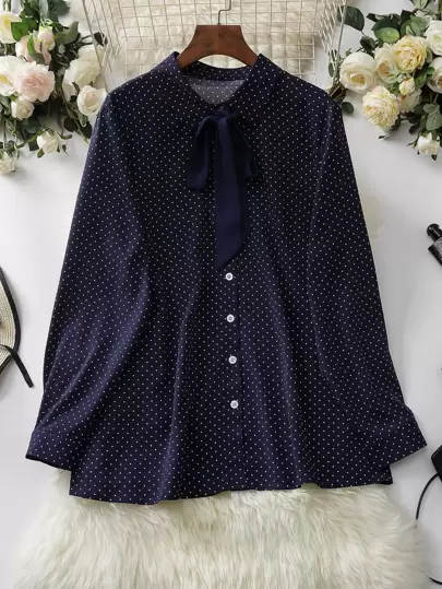 Mulvari Blusa con estampado de lunares de cuello con cordón - Azul Marino - Añade 5