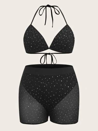 SHEIN ICON con diseño de lentejuelas de espalda abierta con nudo de malla Top halter & Shorts - Negro - Añade 3