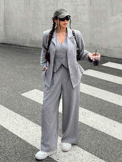 CovetEZ Conjunto de traje de 3 piezas talla grande: Blazer gris de estilo retro, chaleco y pantalones para usar en la oficina - Gris Oscuro - Añade 3