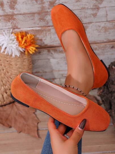 Zapatos planos tipo slip-on de talla grande, de color caramelo, de unicolor, de terciopelo, con puntera cuadrada, zapatos casuales cómodos para uso en exteriores e interiores - Naranja - Añade 4