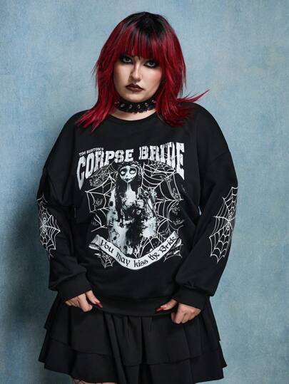 Corpse Bride X SHEIN Sudadera holgada de manga caída con personaje de dibujos animados y eslogan, talla grande, informal, para primavera y otoño - Negro - Añade 1