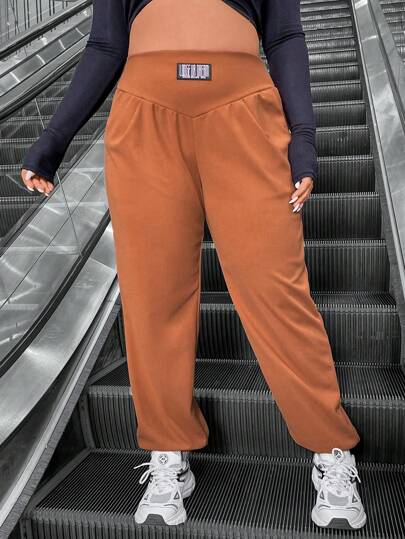 Flirla Pantalones Jogger Casuales De Talla Grande Con Detalles De Parche Y Puños Elásticos - Marrón - Añade 3
