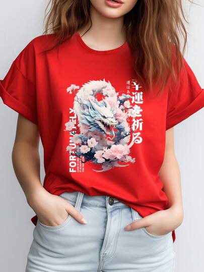 INAWLY Camiseta De Manga Corta De Talla Grande Con Estampado De Dragón Chino Y Letras - Rojo - Añade 7