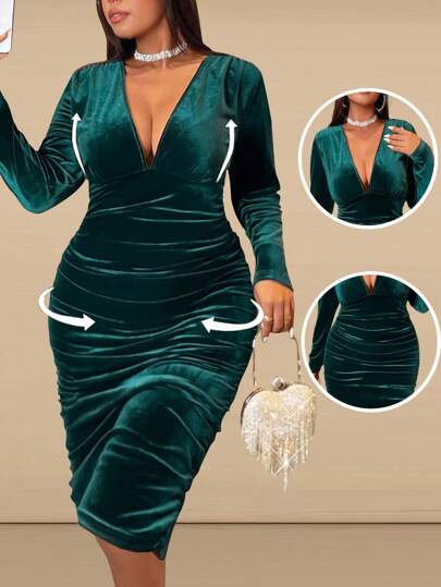 Cravure Vestido de manga larga, cuello en V profundo y plisado, de unicolor, talla grande, para el outfit de Navidad de mujeres en longitud maxi - Verde - Añade 1