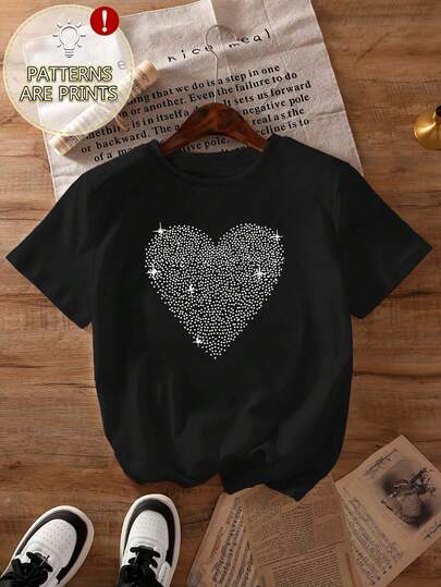 Camiseta de talla grande con estampado de corazones y estrellas, uso diario cómodo y casual - Negro - Añade 5