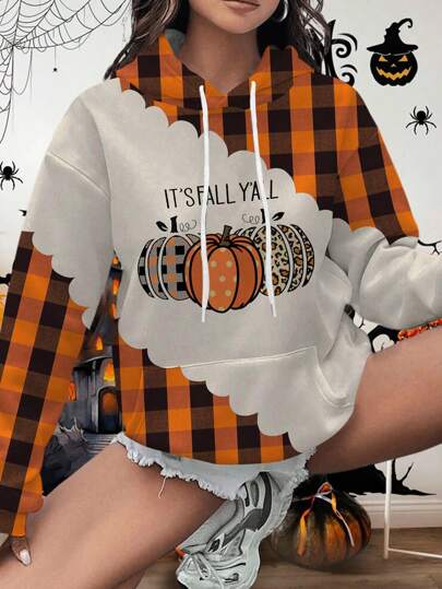 Flirla Sudadera holgada de manga larga con estampado de cuadros escoceses para Halloween, talla grande, otoño - Multicolor - Añade 4