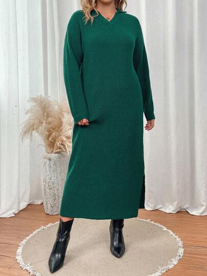 SHEIN LUNE Talla grande Vestido de punto suelto hombro bajo con abertura - Verde Oscuro - Añade 6
