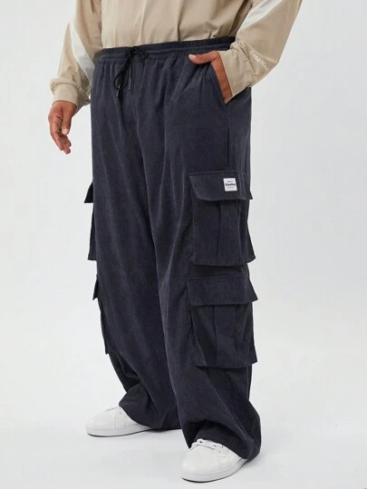 Manfinity VCAY Pantalones cargo de pana, de cintura media, con cordón y múltiples bolsillos, para hombres de talla grande - Gris - Añade 4